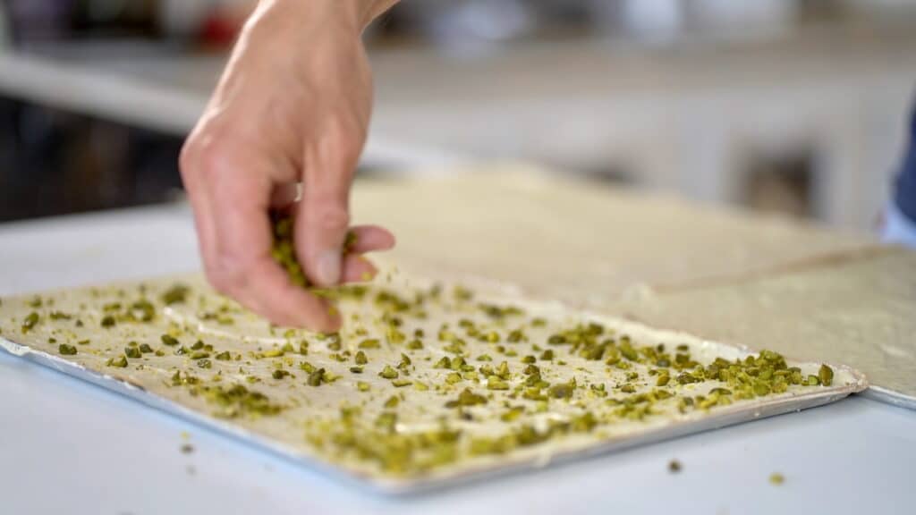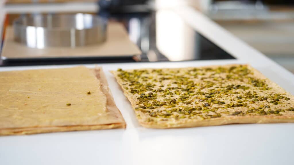 - Bake the pistachio biscuit for 6–7 minutes (at home: bake one sheet at a time). Be careful not to overbake, as the sponge should stay supple—overbaking will cause it to dry out. Once baked, immediately transfer the sponge sheets onto a clean countertop to cool completely.