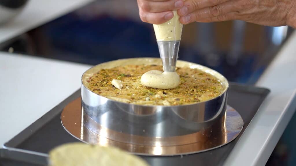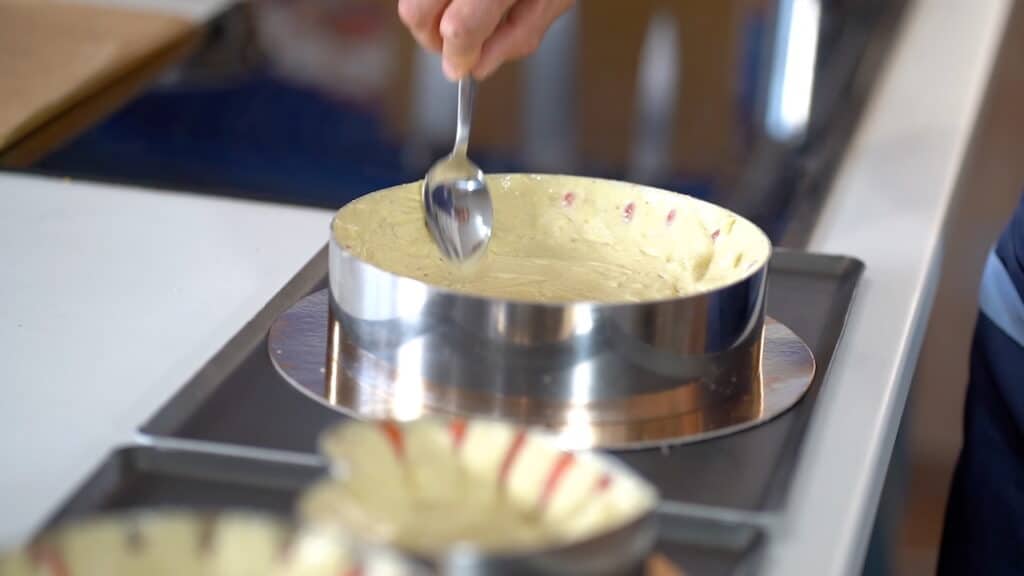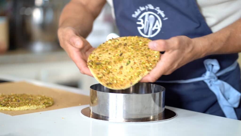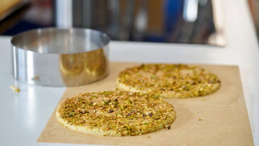 - Carefully insert the first pistachio joconde disc in each cake ring that are lined with collar acetate.