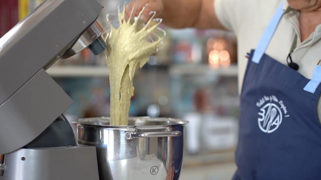 - In the mixing bowl, beat on high speed the almond-pistachio-sugar mixture with the eggs for 5 minutes until pale and fluffy.