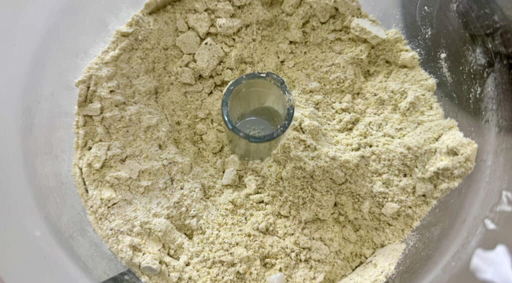 - In a food processor, blend almond meal with pistachio meal, powdered sugar and flour into fine powder.