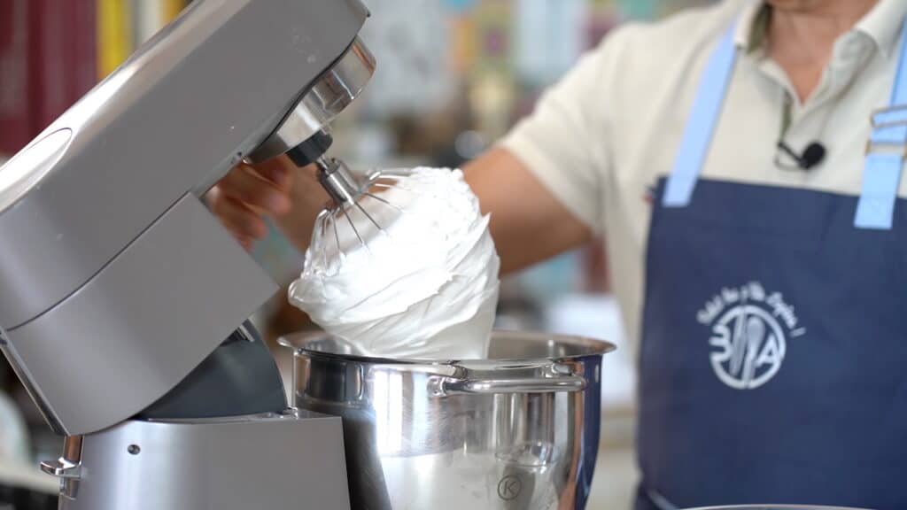 - In the stand mixer fitted with the whisk attachment, beat the room temperature egg whites along with cream of tartar and a third of the sugar on medium speed. When ready, set mixer speed to high and beat egg whites to stiff peaks. Transfer meringue to a large bowl. Preheat fan oven to 400ºF/200ºC.