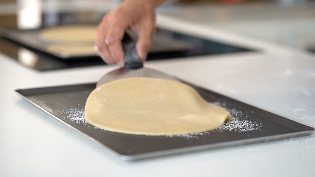- Dust cornstarch straight onto a sheet pan (do not use silicone mat or parchment. Carefully, transfer marzipan disc over.