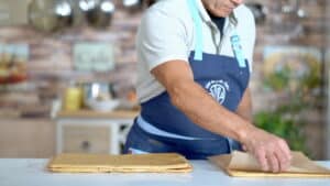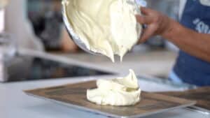 - Divide batter into 3X300g equal portions onto the prepared baking sheets.