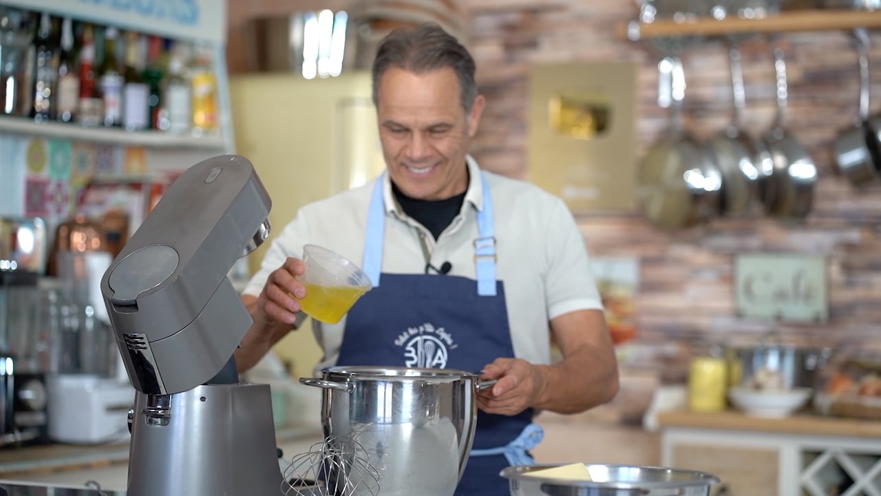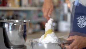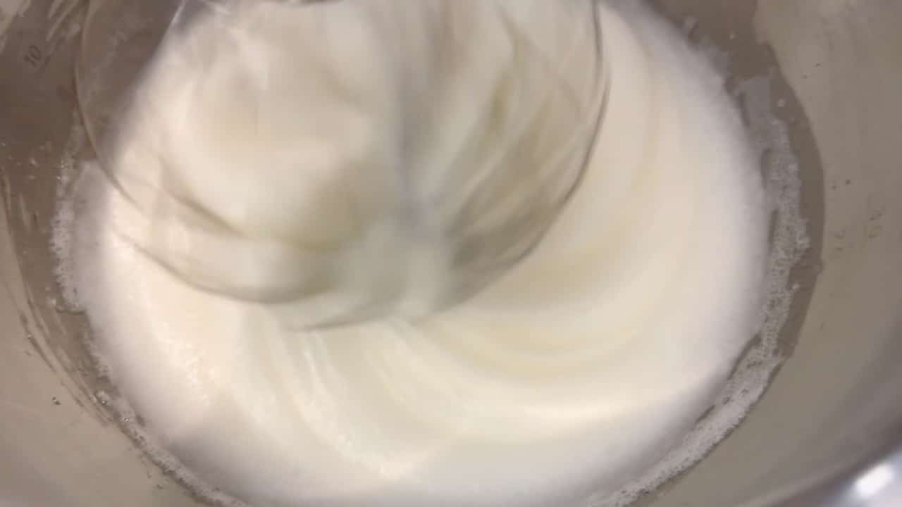 - When ready, set mixer speed to high and beat egg whites to stiff peaks adding remaining sugar gradually.