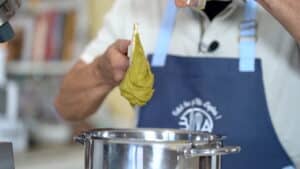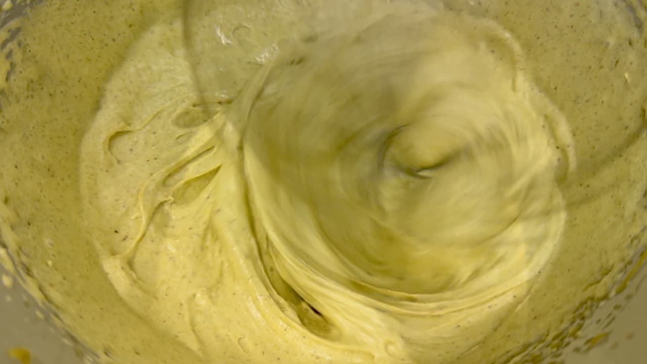 - Fold a third of the meringue into the pistachio batter. Add the remaining meringue.