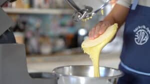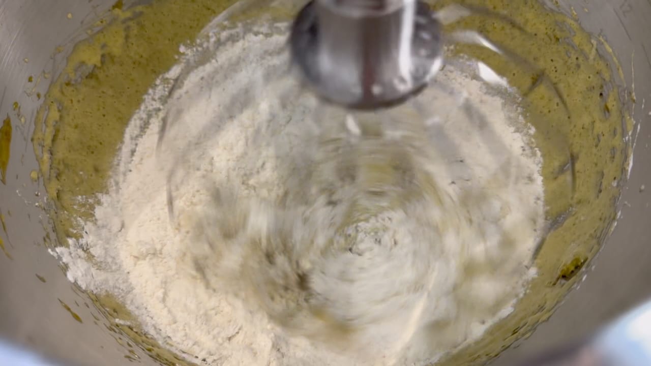 - Lower the speed, add flour and mix for 2 minutes on medium speed until well combined.