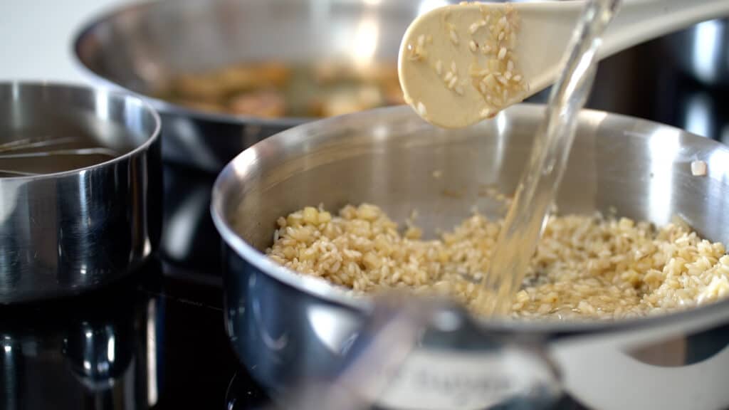- The mushroom water can be subbed for chicken stock. Keep stock in a separate pot over low heat. This helps the rice cook evenly without cooling down when you add the liquid. In a sautoir melt butter over medium heat. Add the onions along with the cubed mushrooms, and cook gently until soft and translucent (about 5 minutes), but not browned. Add the rice and stir it to coat the grains in the fat. Cook for 3 minutes until the rice becomes slightly translucent around the edges. This step helps create a creamy texture later. Pour in white wine, and stir the rice continuously until the wine is absorbed.