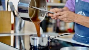 - In a saucepan, reheat the reserved cooking liquid from the pork roast. Pass it through a chinois to remove most of the impurities. Return the liquid to the saucepan, then add some of the reserved liquid from the baked apples to taste. Reduce by half, and season with salt and pepper as desired. The sauce can be thickened with a slurry or beurre manié.