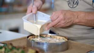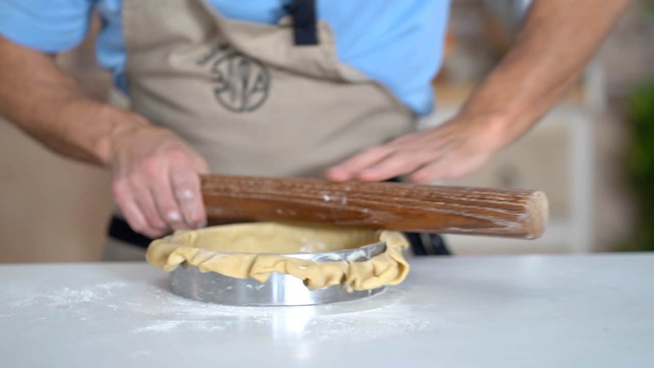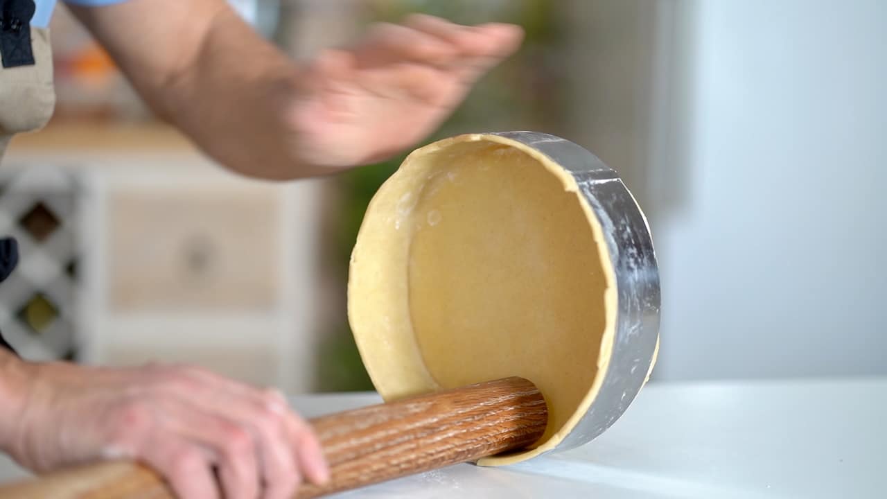 - To ensure a sharp definition, position the cake ring upright. Hold it and place the end of the rolling pin against the inner curve. Gently press the dough down, following the contour of the ring. Freeze the quiche shell for 15 minutes.