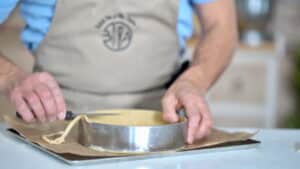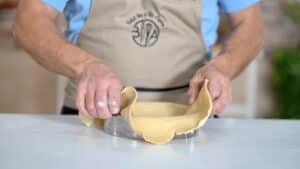 - Gently roll the dough around your rolling pin, then unroll it over the cake ring. Let the dough slump naturally into the corners and sides. Do not stretch it. Stretching causes guaranteed shrinkage during baking. Gently press the dough into the sides and the bottom edge using your thumbs or a small piece of excess dough.