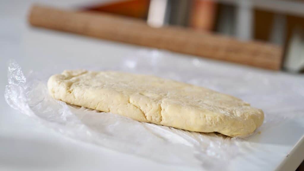 - Shape the dough into an 8×5-inch (20×13cm) slab and wrap it in plastic film. Chill for an hour to relaxe the gluten (making the dough easier to stretch) but also ensures the butter stays cold and firm. This is vital for the subsequent lamination process, where cold butter creates distinct layers as the dough is folded and rolled.