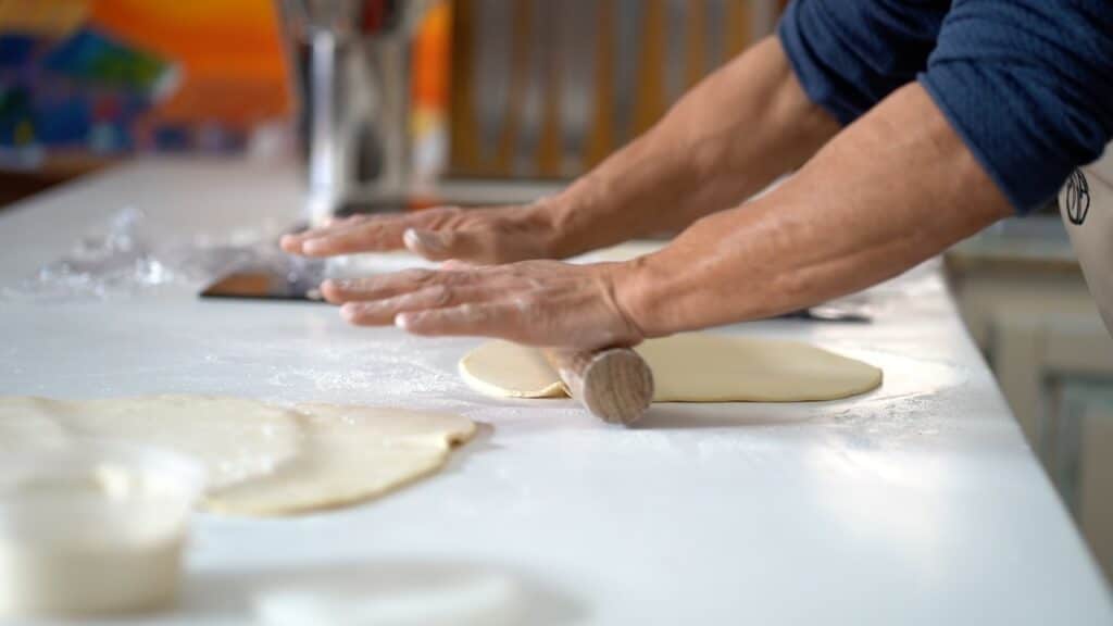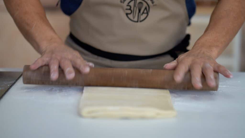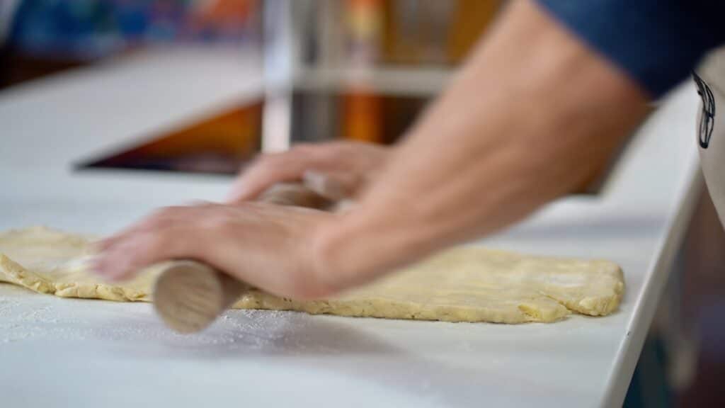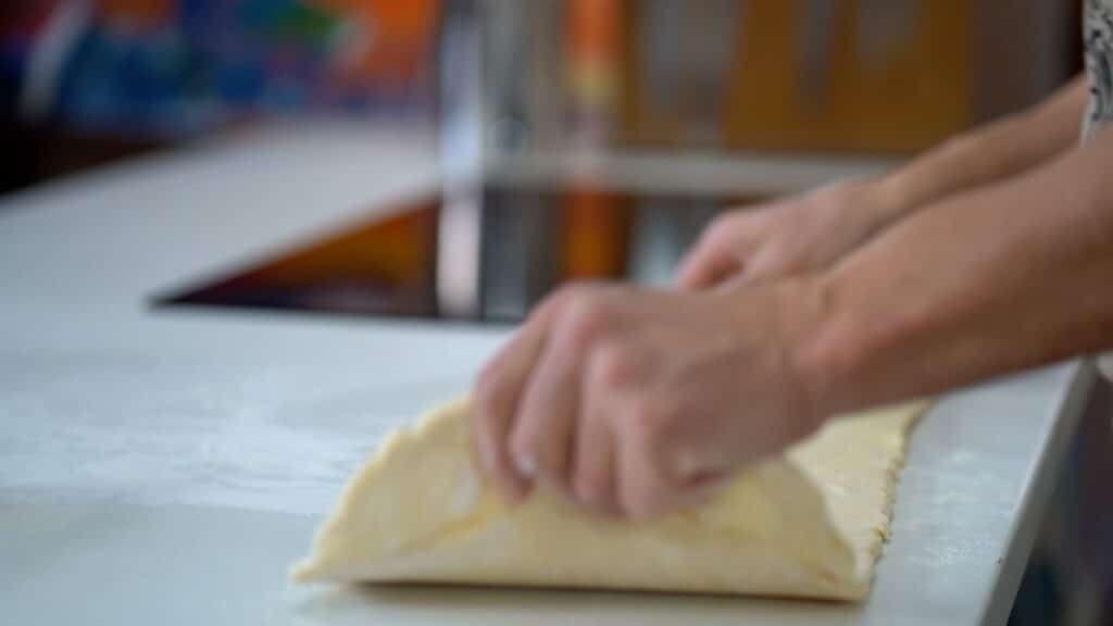 - Roll the dough into a long rectangle (imagine dividing it into three equal sections).
