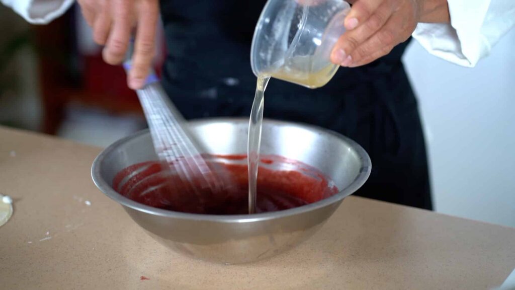 - In a large bowl, warm up raspberry puree to 77ºF/25ºC. Microwave the bloomed gelatin for a few seconds to turn it into liquid stage. Immediately, Incorporate it into the tempered raspberry puree with the whisk.