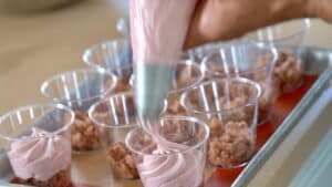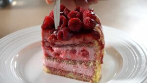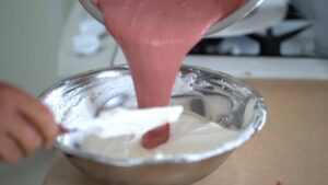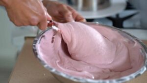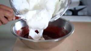 - Add the raspberry mixture into the remaining meringue-whipped cream.