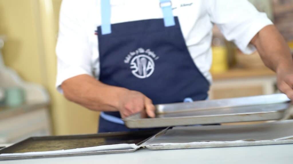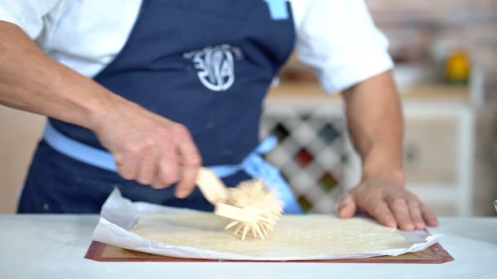 - For the bottom pastry sheet, prick it with a dough docker or a fork. Do not prick the 3 remaining puff pastry sheets.