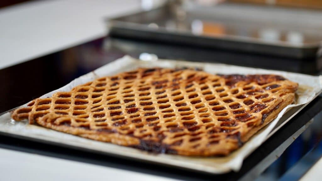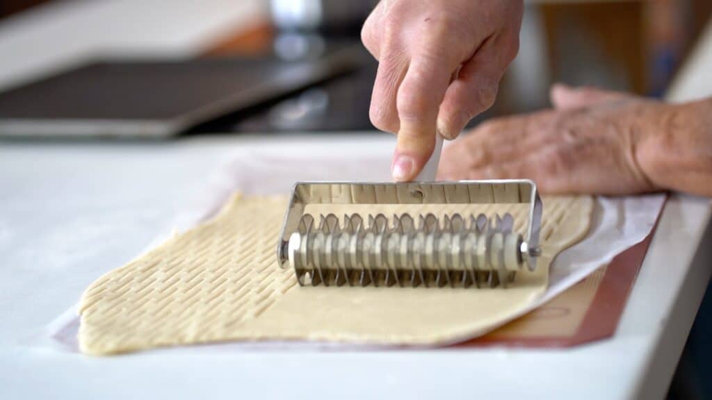 - Flour your lattice dough cutter. Turn the second puff pastry sheet into lattice design.