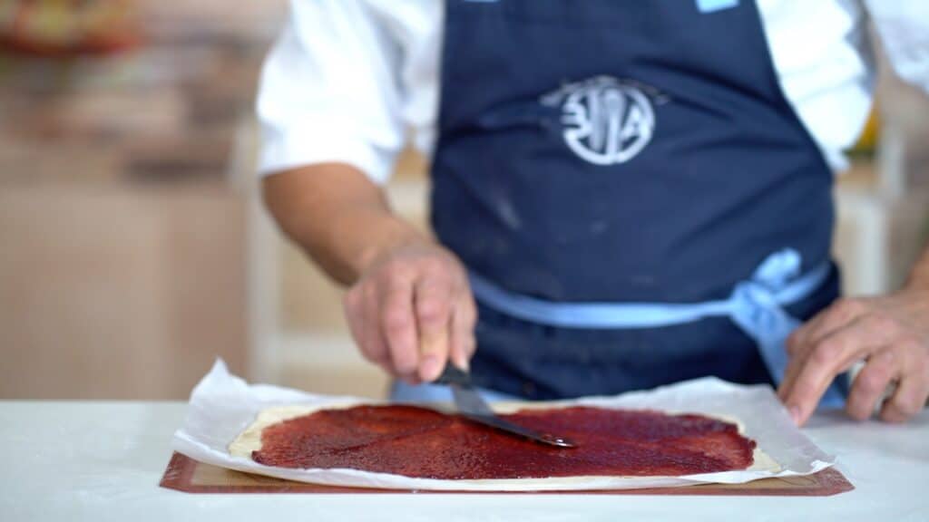 - Spread a fair amount of the raspberry jam over the pricked pastry; freeze to set.