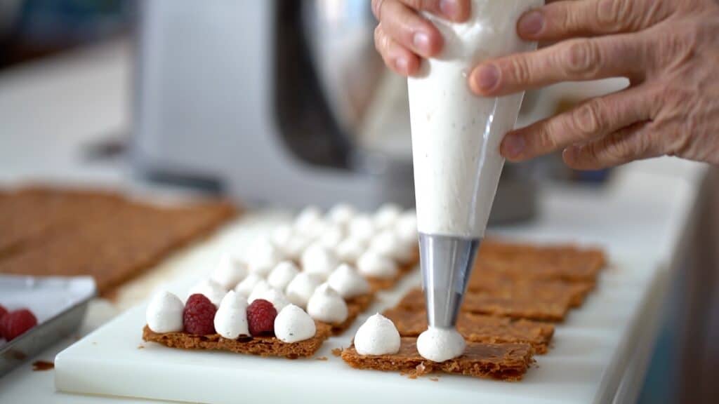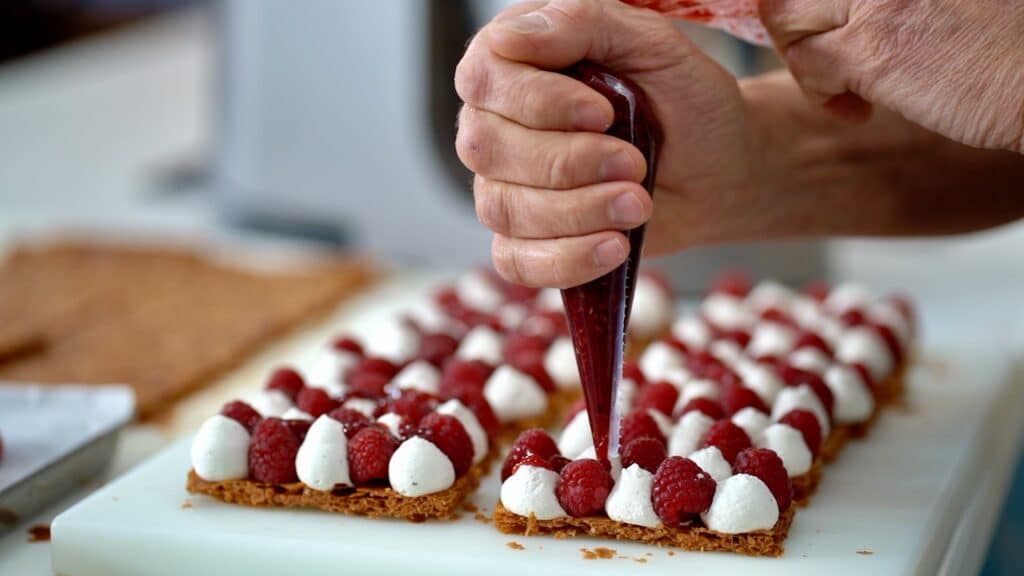 - Pipe out 5 dollops of chantilly on the first 12 pastries. Fill the gaps with raspberries.