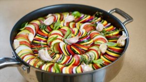 - Line baking tray with greased parchment or silicone mat and salt bottom of the tray. Overlap tomato slice, eggplant, zucchini, yellow squash – repeat 4 more times. Season with salt, thyme and crushed garlic. Refrigerate for an hour or for up to 2 days. Drizzle some olive oil, season with pepper – Top with parchment and foil and cook at 300ºF/180ºC for 30 min. Uncover and cook for 30 mins more at 350ºF/180ºC.