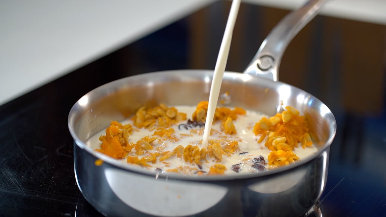 - Cover the pumpkin guts with milk, add star anises, orange zest and a pinch of salt. Bring to a boil, and cook 25 minutes on medium-low. Turn off the heat, cover the pan and leave it to stand for 20 minutes or longer.