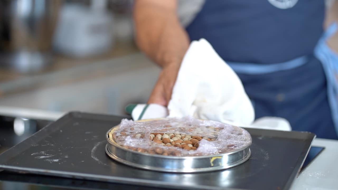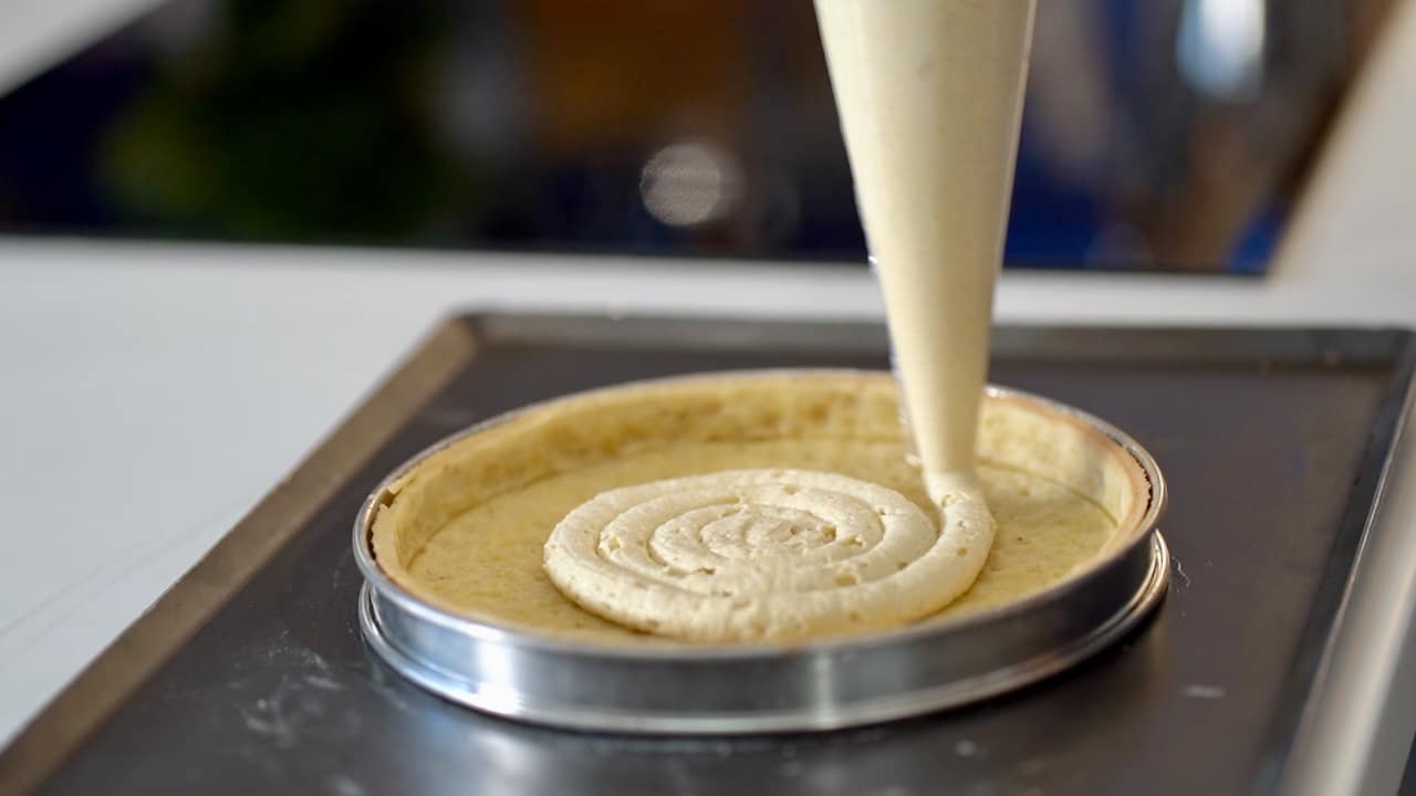 - Freeze the tart ring and baking tray lined with parchment or plastic acetate sheet. Churn your roasted ice cream custard mixture.