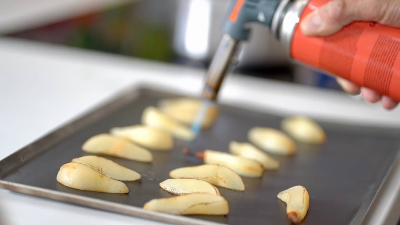 - Arrange pear wedges onto a baking tray and blowtorch until edges get dark. Let them cool and keep refrigerated.