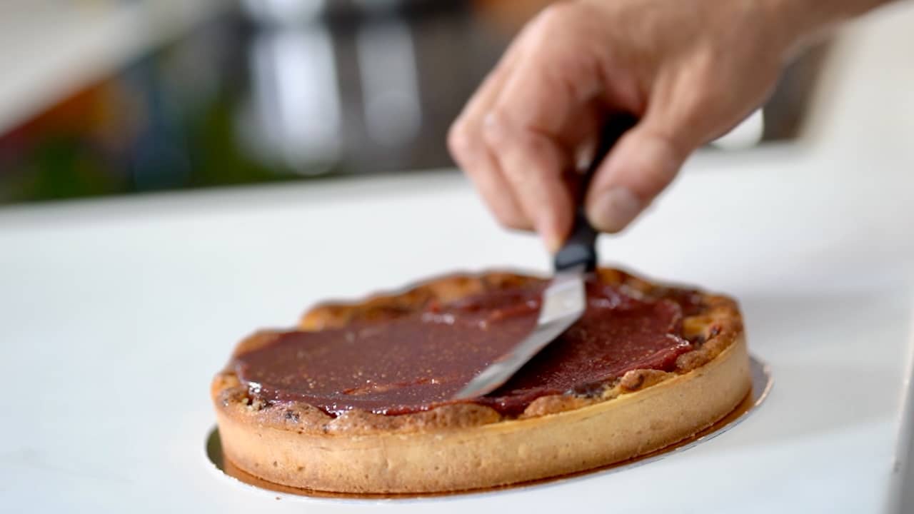 - Blind bake sugar dough tart shell for 15 minutes in a fan oven sets at 330ºF/160ºC. Remove pie weights, and let cool to room temperature.