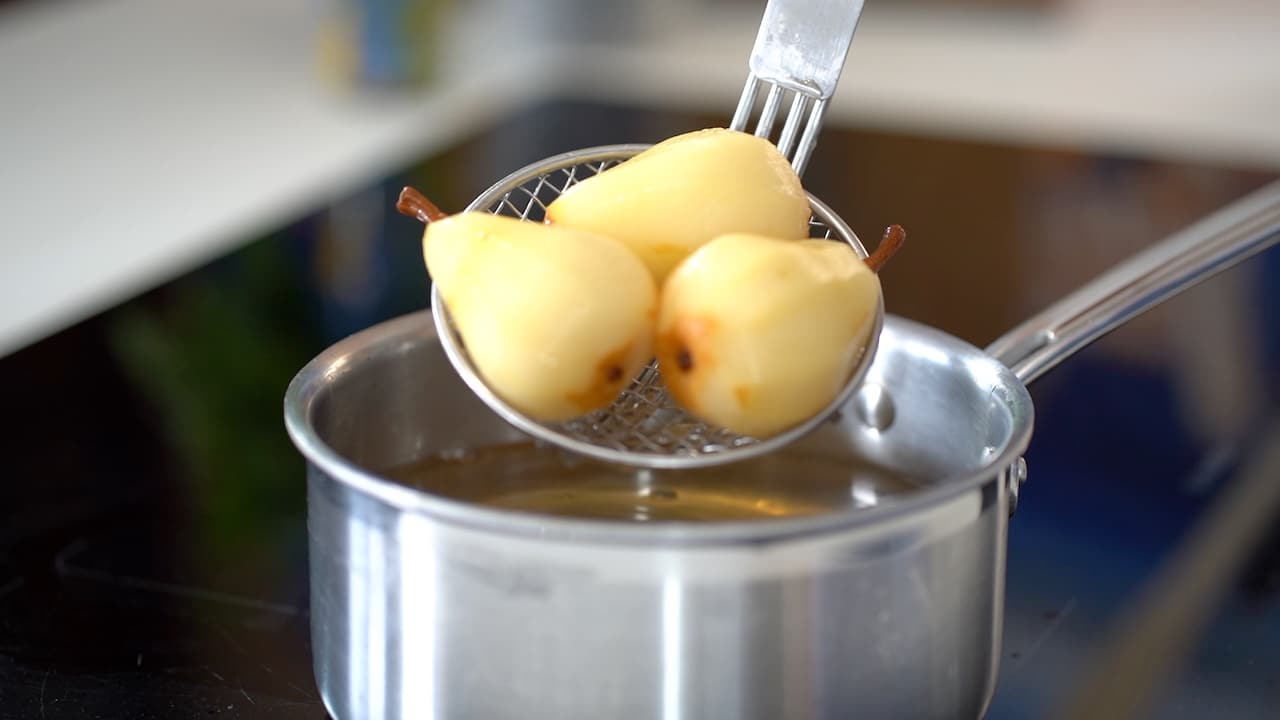 - This method is used to enhance the pear's flavor, sweetness, and texture. Bring water and sugar to a boil. Squeeze the lemon in the syrup. Add spices if desired such as vanilla and star anise.. Plunge the peeled pears in the hot syrup. Cover the saucepan tightly with a piece of stretched plastic film. Bring to a quick boil, and cook to gentle simmer for an hour. Check the doneness – it should never be overcooked but rather quite tender with a firm sensation when going through the core of the fruit. Leave pears in syrup until it is cool. Refrigerate for up to a week until ready to use (in their syrup).