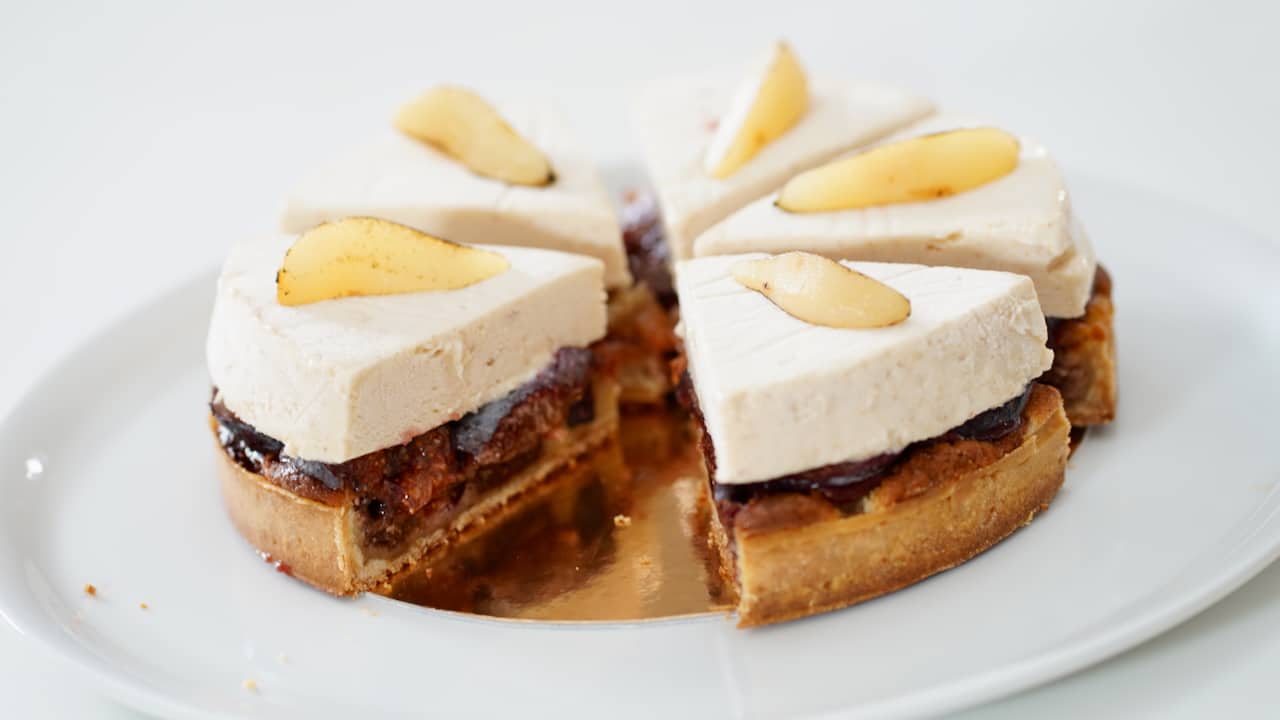 - Right before serving, top each slice with the roasted pear ice cream and pear brûlée.