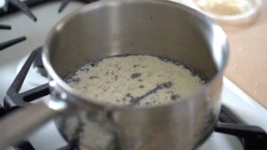 - In a small saucepan, add water, sugar and glucose. Cook syrup on medium high heat.