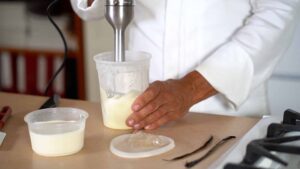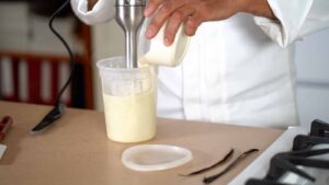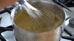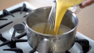 - Temper yolk mixture with one third of the hot milk.