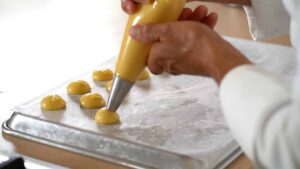 - In a separate baking tray, pipe a large 4 inch/10 cm diameter choux.