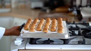 - Dust pate a choux with powdered sugar. Bake one tray at a time at 375ºF/190ºC for 35 min. Turn oven off leaving the oven door ajar for 10 minutes. Lower temp to 350ºF/180ºC if using convection oven.