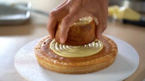 - Place the large puff in the center of the cake.