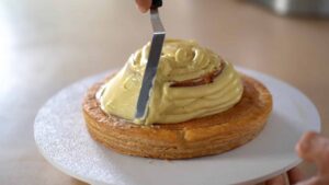 - Cover the entire cake dome with more pastry cream, and smooth out using an offset spatula. Place cake in the refrigerator.