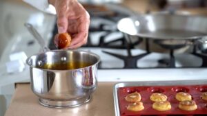 - Caramelize puffs. For better results, have them cooling off in half-sphere silicone mold. Once done, refrigerate caramelized puffs for 20 minutes and remove from the silicone mold.