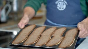- 18 slices Ancient dark rye bread (3 slices per serving) Recipe