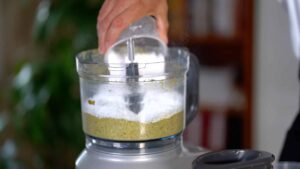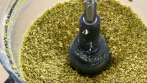 - Lightly toast pistachios and cool. In a food processor, turn pistachio into meal.