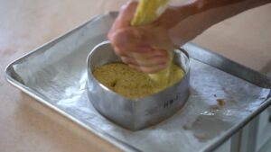 - Grease cake pan and line with parchment. Lay frozen pastry on the bottom.