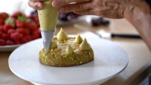 - Add dots of pistachio paste and soft raspberry or red fruit jelly, and crushed pistachios.