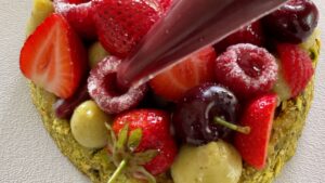 - Arrange red fruits artfully (strawberries, raspberries, cherries). Brush fruits with neutral mirror glaze if desired.