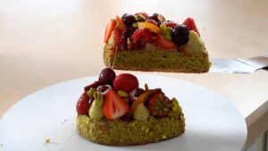 - Top pistachio cake with pistachio ganache.
