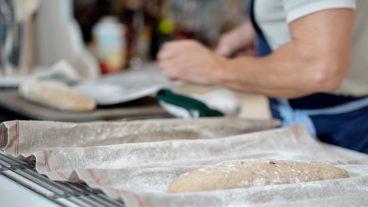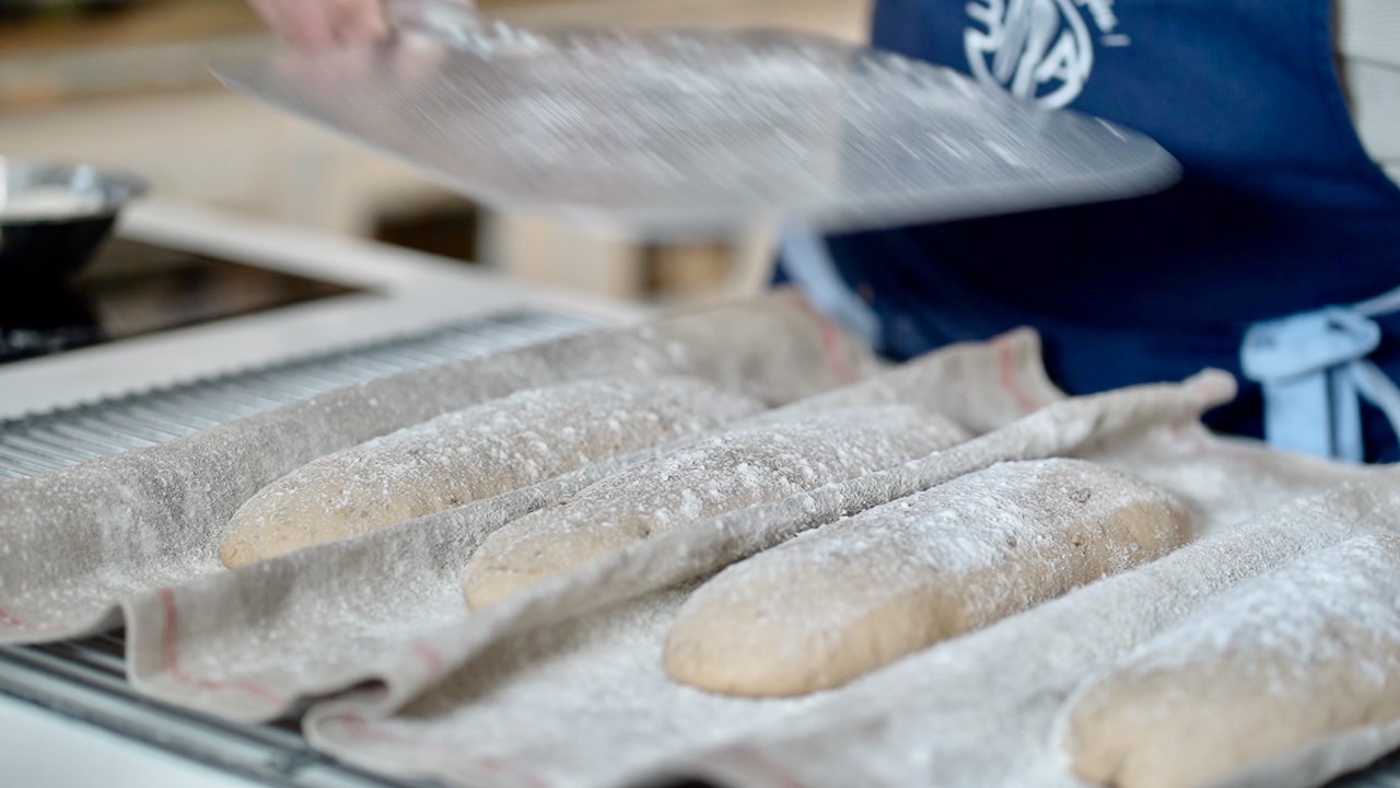 - Uncover the proofed loaves and dust some flour on top. Using a pizza peel or a narrow wooden board like used in bakeries, gently lift the edge of the baker's couche and flip the proofed loaf onto the peel (skin side up).