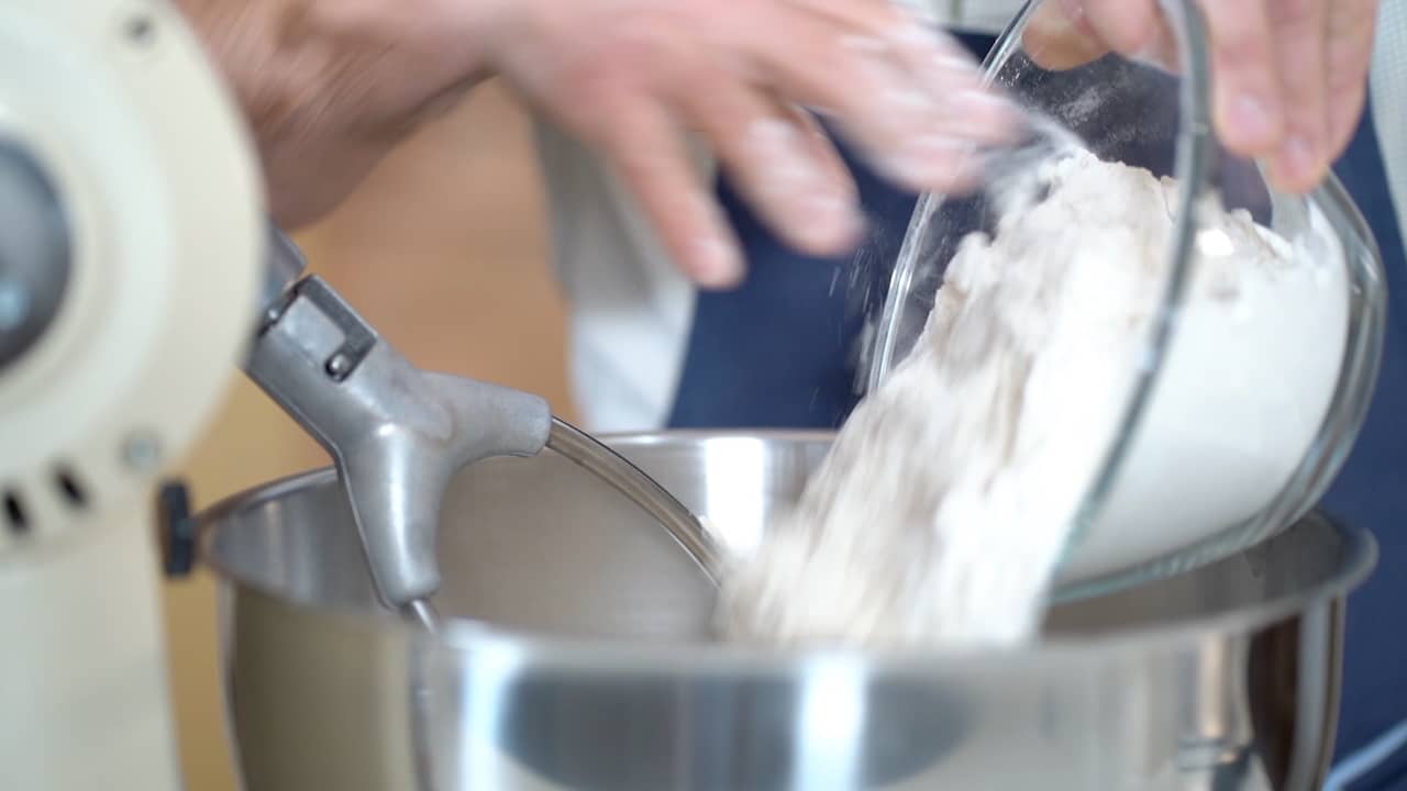 - Add the flours and begin to mix on low speed for 15 minutes. Scrape down the sides of the bowl and the hook periodically. This helps incorporate the ingredients more evenly and allows the dough to come together into a cohesive mass more quickly.