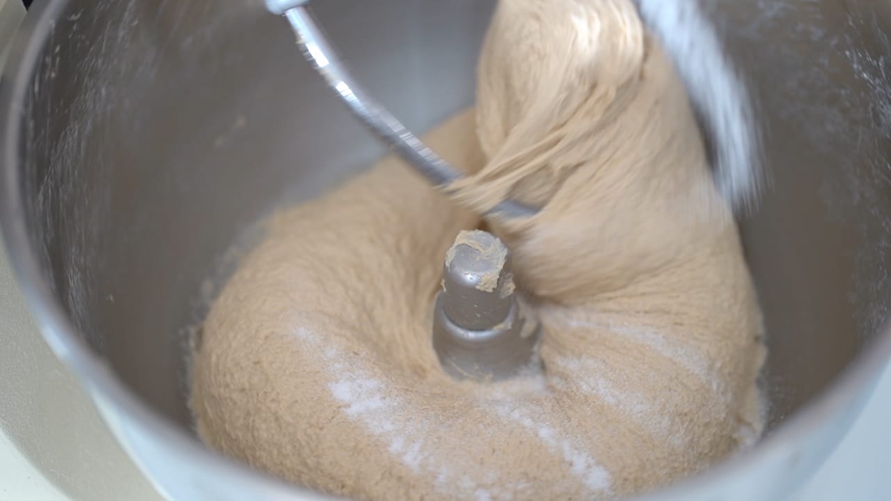 - After 10 minutes mixing, add the salt and knead for 15 minutes more (reduce the kneading time by two if mixing on second speed).