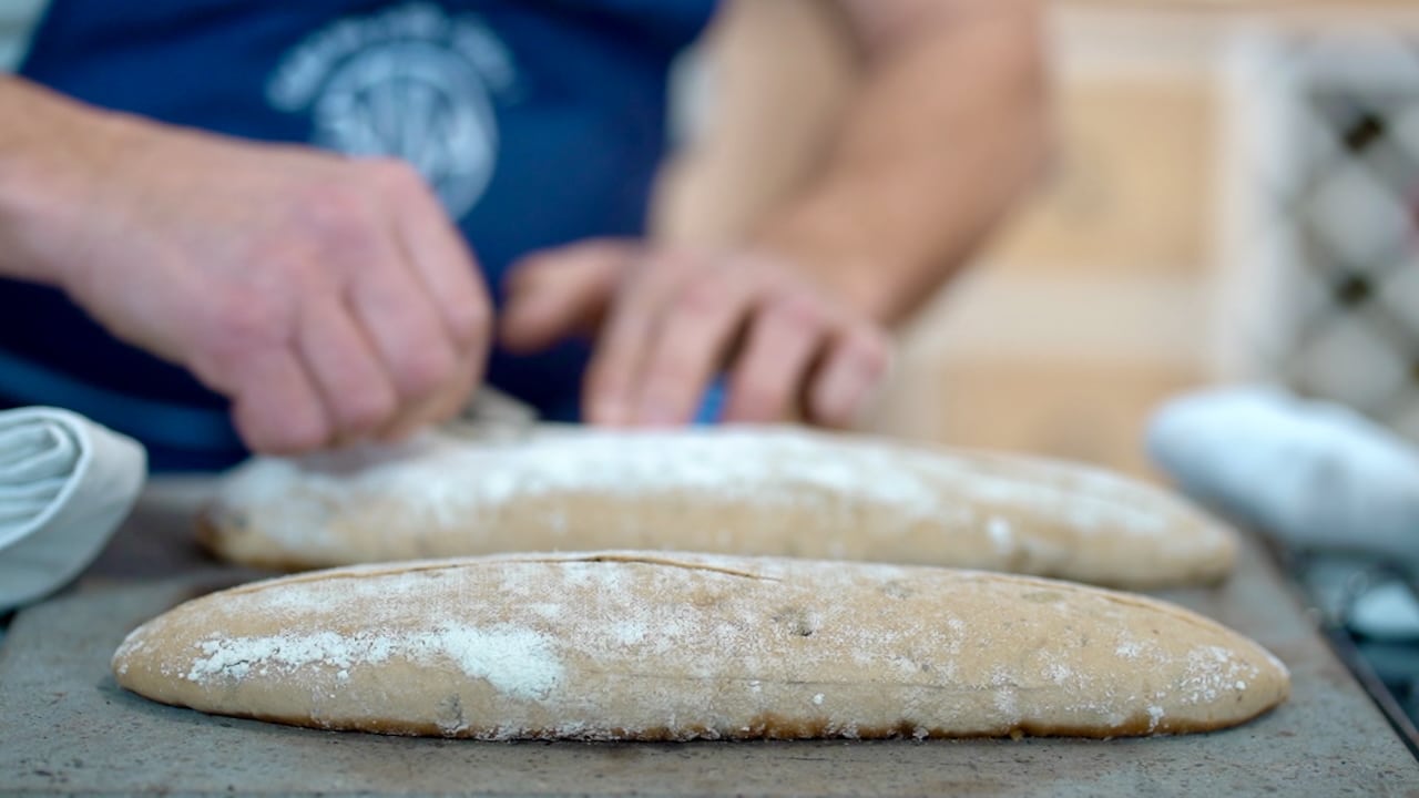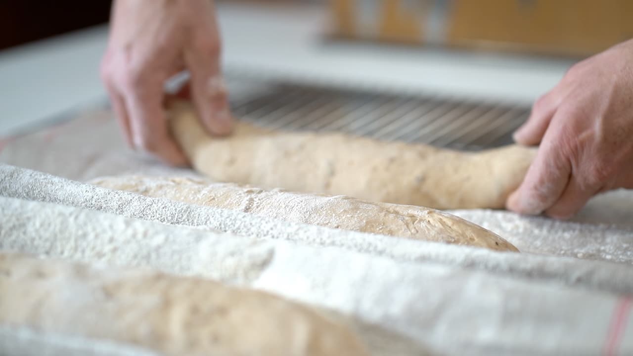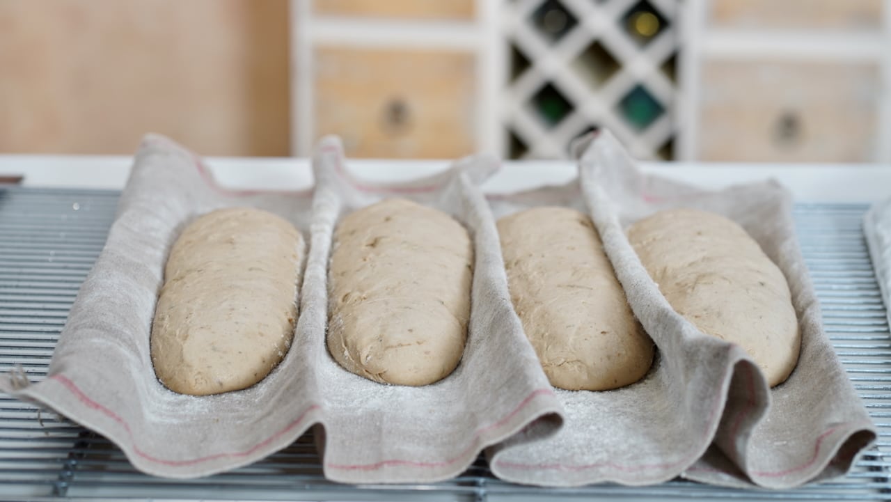 - Arrange bread over the floured bakers couche, and seam side up.