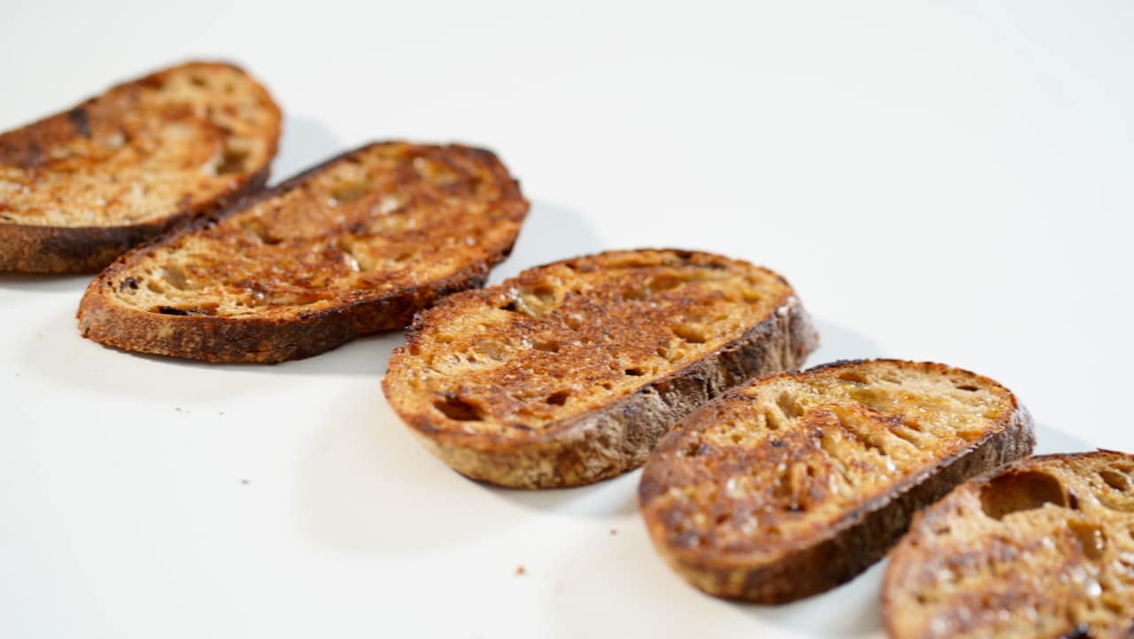 - Toasted slices of sourdough morel-garlic bread.