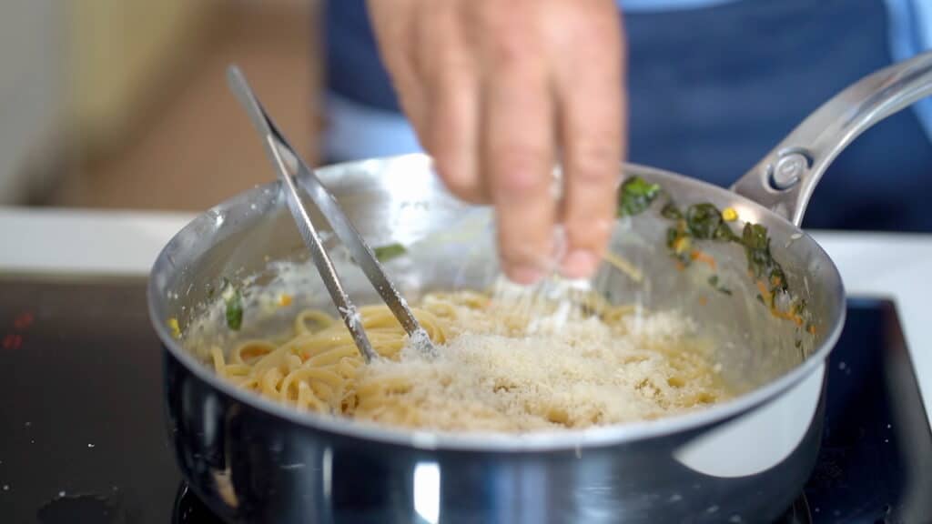 - Add more hot pasta water if necessary (the starch from the pasta water helps bind the sauce). Keeping the pan off direct heat while adding the cheese prevents overheating, which can cause the proteins in the cheese to seize up and create a grainy or clumpy texture.