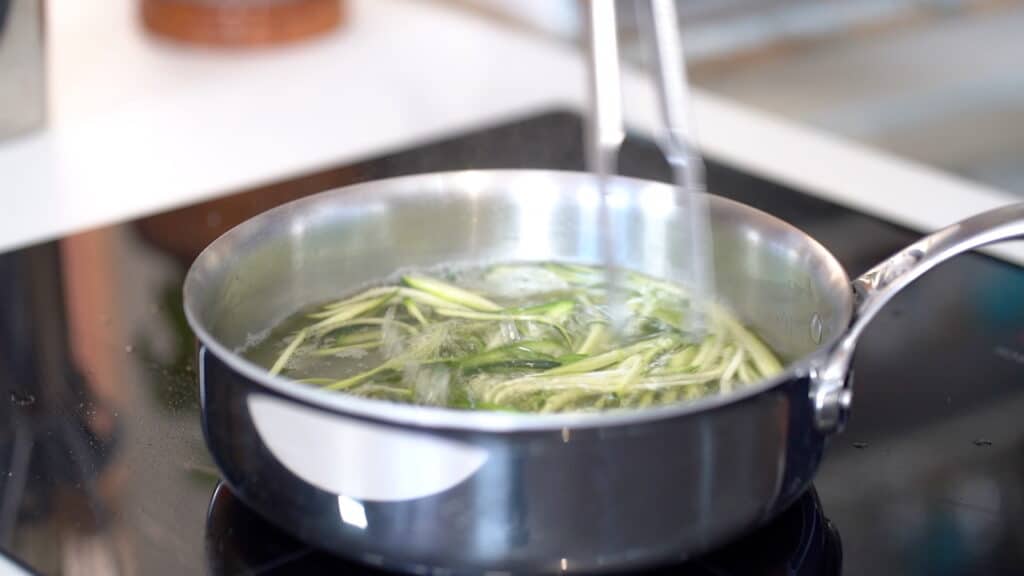 - Cook zucchini in heavily salted water for 3 minutes. Transfer them in ice bath to cool off. After a quick bath, drain.