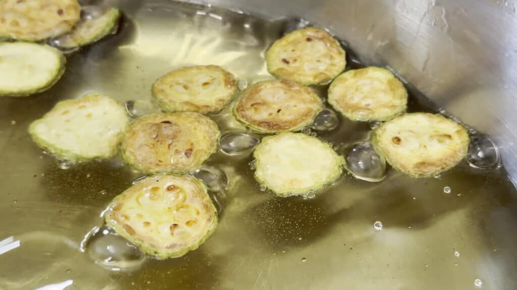 - Heat vegetable oil in a deep pan (about 1-inch/2.5cm deep) to medium-high heat (170-180°C/340-355°F). Fry the zucchini on both sides until golden and crispy for about 8 minutes. Remove with a slotted spoon and drain on paper towels. Lightly salt while hot.
